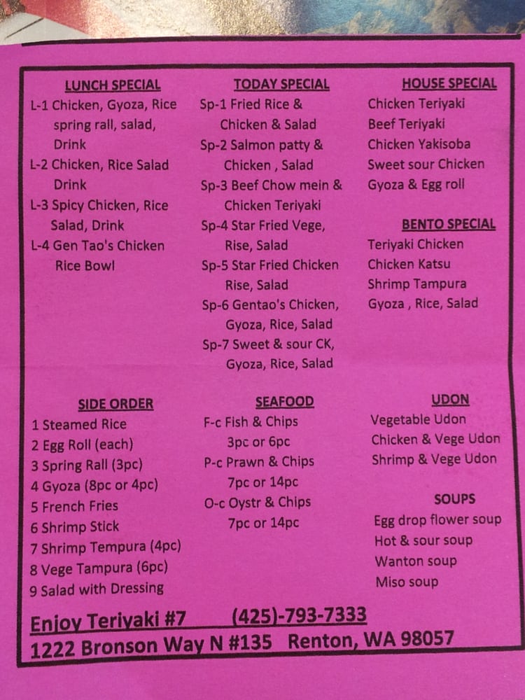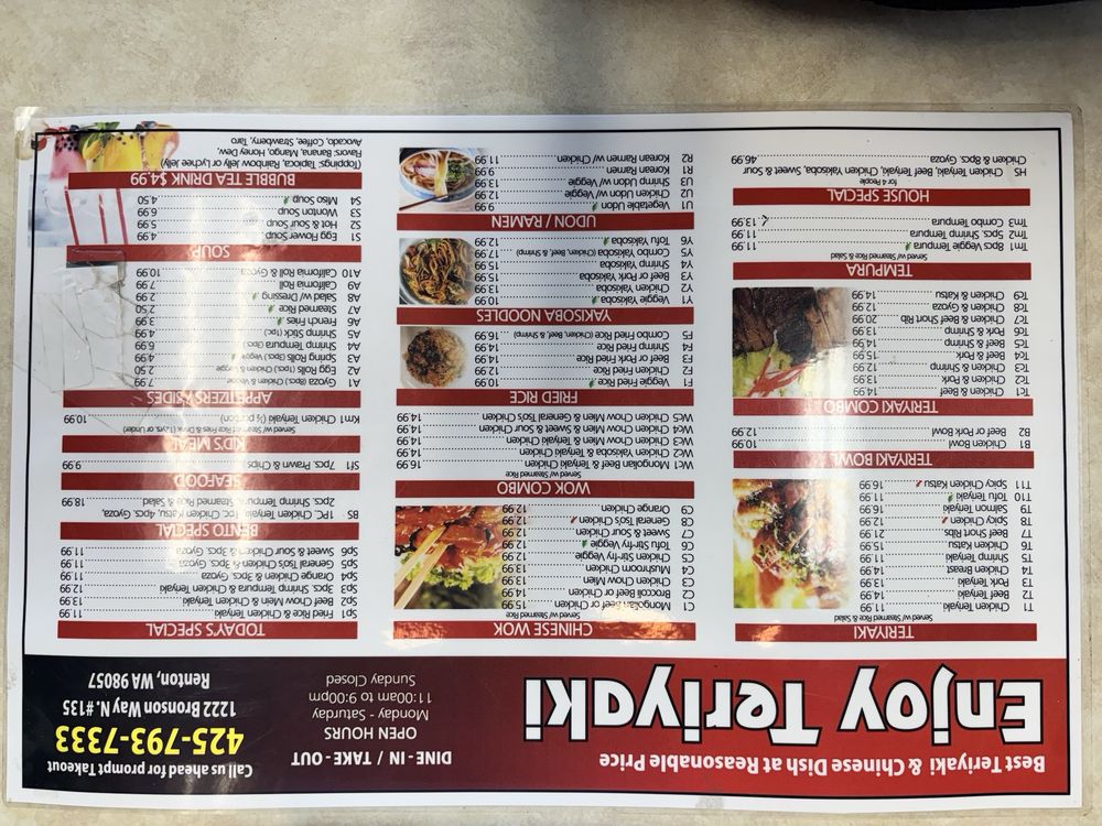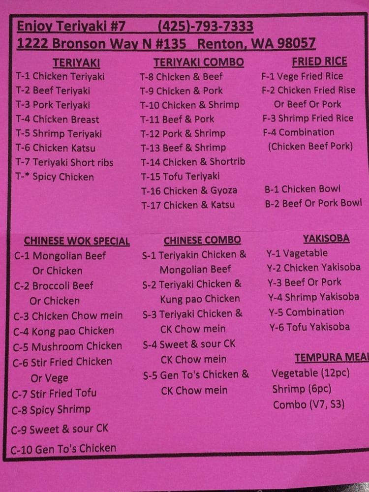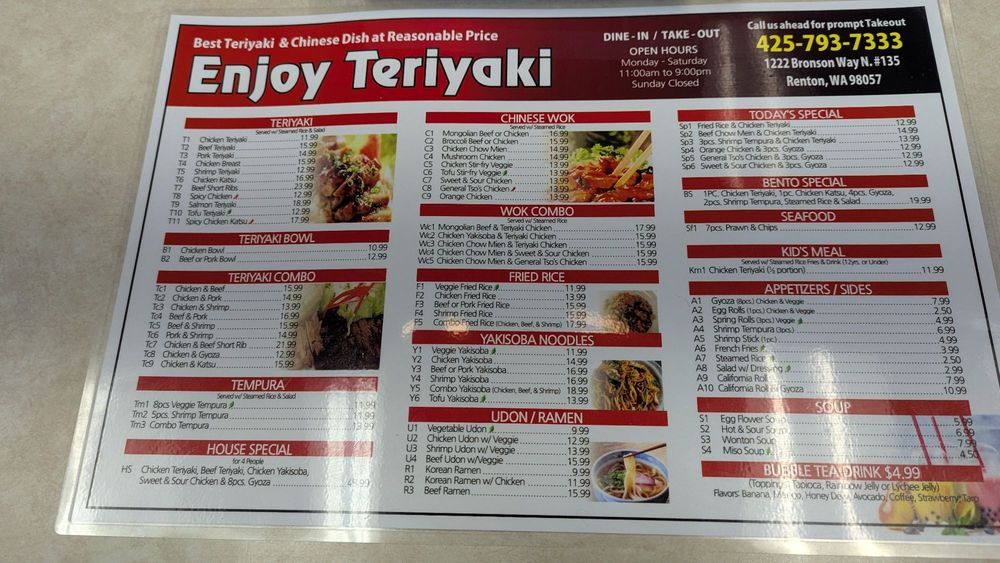 Welcome to Enjoy Teriyaki, where the rich flavors of Japanese cuisine meet a casual dining experience in Renton, WA. Located at 1222 Bronson Way N, this restaurant not only offers a diverse menu of teriyaki dishes but also a variety of Chinese favorites, accommodating every palate.