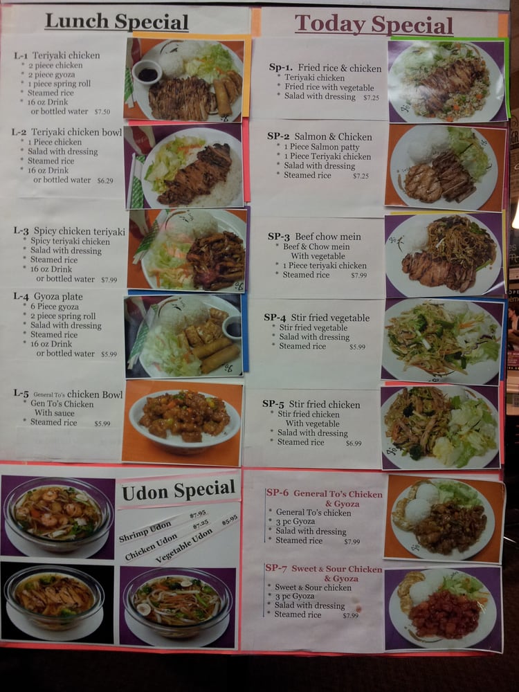 Chicken teriyaki, beef teriyaki, chicken yakisoba, sweet, and sour chicken, and gyoza (8 pieces).